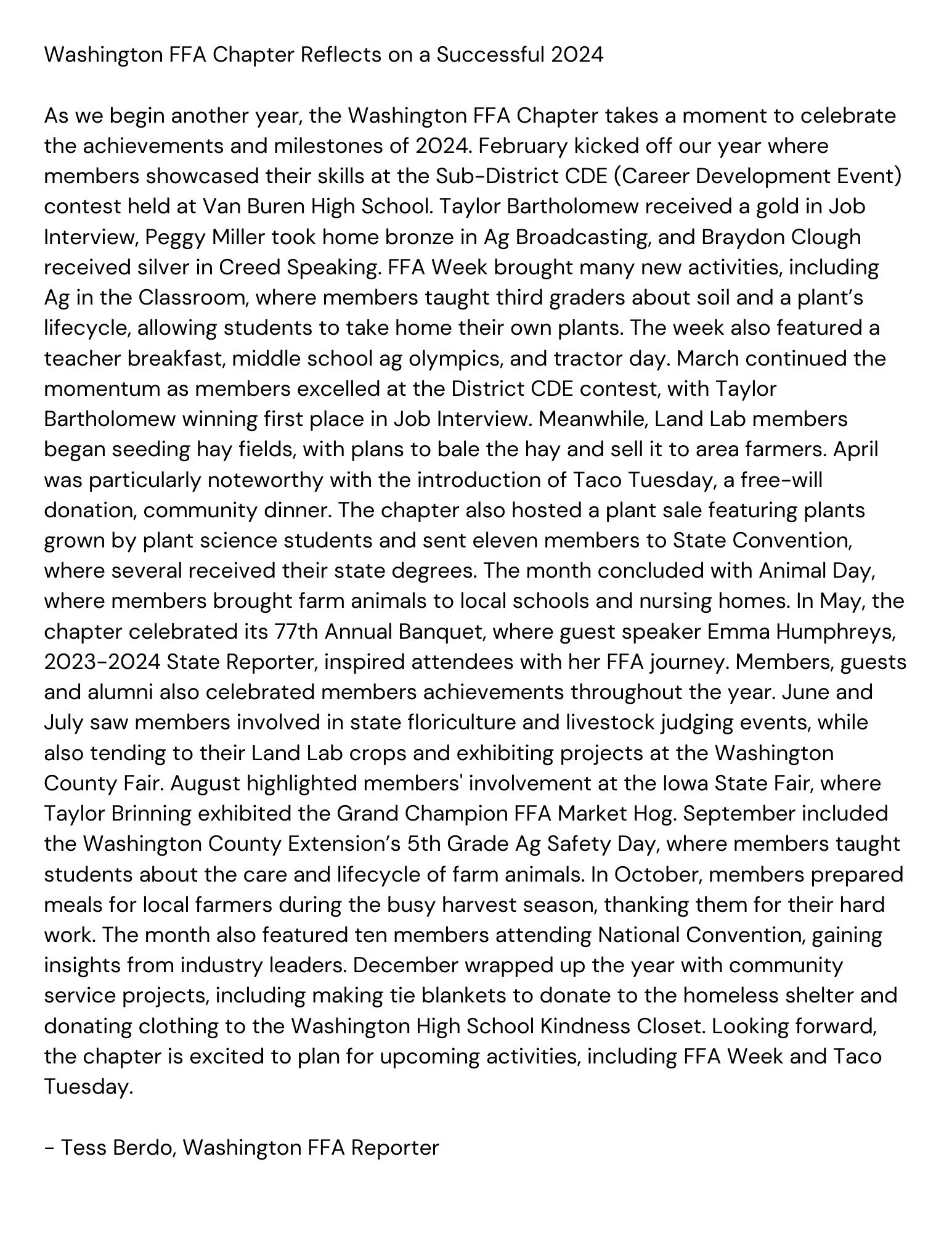 I wrote a news article for our local newspaper that reflected on the activities and events our FFA chapter participated in for the 2024 FFA year. The article kept the community informed while showcasing our chapter’s involvement, achievements, and goals for the year ahead.