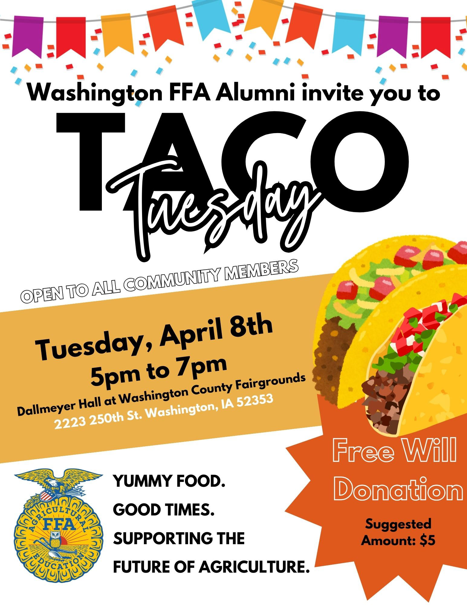 I designed a bright, eye-catching flyer for our community Taco Tuesday meal, incorporating vivid colors and visuals while aligning closely with the national FFA brand kit to maintain consistent branding.